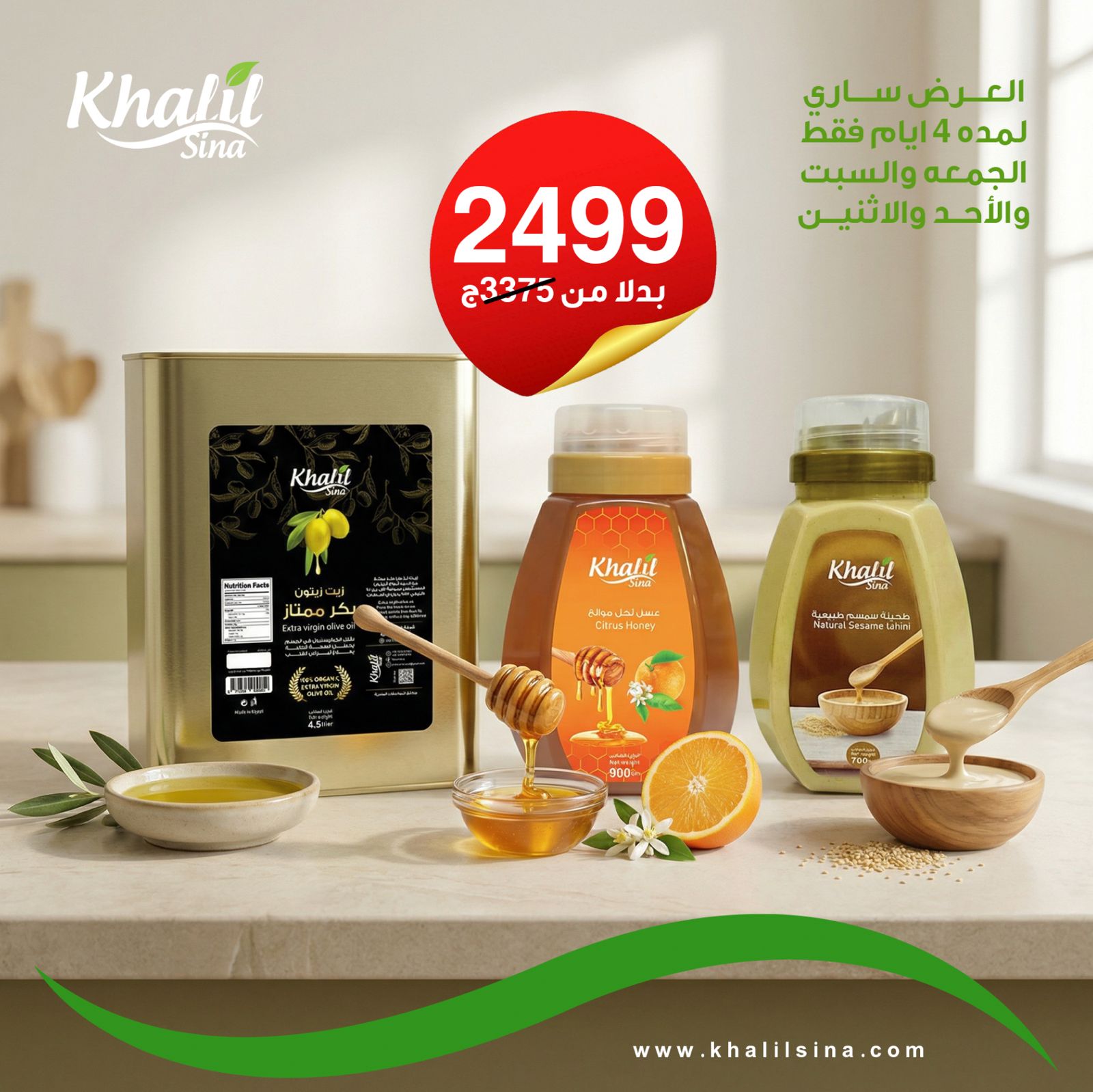 صفيحة زيت زيتون 4 ونص لتر + عسل نحل موالح 900 جرام + طحينة سمسم خام 700 جرام